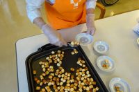 今回はラスクを作りました。材料=お麩(小さい物)と砂糖とバターです。ホットプレート上でバターを溶かし砂糖を混ぜ麩を入れて焼いて行きます。焼き加減も絶妙に行ないました。焼きあがったらシュガー砂糖をふり掛け完成です。程良く焼けサクサク感が出て美味しかったと伺い安心しました。メニューについては作りたいもののリクエストを受け付けており、毎週・月曜日の午後はおやつ作りを行なっております。