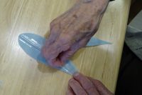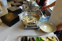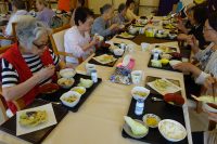 利用者さんの目の前で料理人により天ぷらを揚げて頂き、アツアツの天ぷらを召し上がって頂きました。大きなエビ・のどくろをメインに季節のお野菜を添えました。天ぷらを揚げる音が聞こえてくる中、料理の説明を行ないました。主婦だった頃は家で料理を作っていた頃を思い出すと話しておりました。出来上がって提供されると大きいエビで沢山あり嬉しいの言葉を伺う事が出来ました。食べても大変美味しいと皆さんから伺えました。作っているのを楽しみに待っているのもいいね~、出来ればお酒でも少し入れたいなと男性より・天ぷらやさんの思い出話も聞かれました。次回も出来たてをお願いしたいな~と・・・皆さんが喜んで頂きいつも以上にいっぱい食べられたようです。