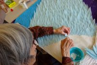製作状況)大きな板の下書きされた所に、紙縒り(こより)を一本づつ糊を付け貼り付けて行く作業です。