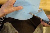 今回ペガサスの羽根を作っています。生地を切り真中に針金を入れたあと板に貼っていきます。完成後に羽根を起こし羽ばたいている状態に見せます。
