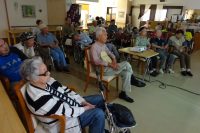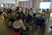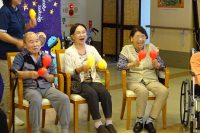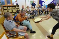 音楽療法を受けました。始めの歌で、雨降りお月さん、バラが咲いたを歌いその後、参加者全員でマラカスを持ってEvey oneを歌いながら楽器と組合せ音楽へ引き込んで行くプログラムです。楽器では太鼓、木魚、カラーベルを使って演奏に合わせ歌いました。演奏会的に指揮も入り歌い出だしから行ないました。笑顔もあり楽しく出来ました。写真では先生より太鼓やマラカスにより歌いながら演奏も行ないました。毎月第二、第四木曜日の14時~15時まで音楽療法の時間帯です。見学や体験も受付けています。