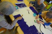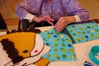 製作状況)大きな板の下書きされた所に、紙縒り(こより)を一本づつ糊を付け貼り付けて行く作業を行なっています。群馬ちゃんの服は生地を縫い込みました。顔は手編みした糸を張りつけて馬の表情を出しております。