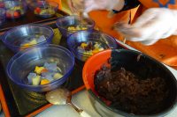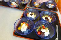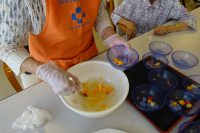 今回はフルーツあんみつを作りました。①白玉作りではひとつひとつ丸めて湯がきました。②ミックスフルーツを器に小分けする。③あんと白玉を小分けし最後にさくらんぼを添えて綺麗に完成しました。皆さん楽しくおやつ作りされておりました。食べても美味しかったと伺っております。メニューについては作りたいもののリクエストを受け付けております。