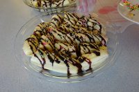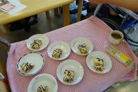 今回はバナナチョコを作りました。バナナを切り、①チョコレート溶かし切ったバナナにアクセントで塗り、その上に小さなチョコ菓子を振り掛けました。②各自皆さんより串に挿したバナナを直接チョコレートポンデュにして頂きました。初めての試行で楽しく作っておりました。食べても美味しかったと安心され良かったです。メニューについては作りたいもののリクエストを受け付けております。