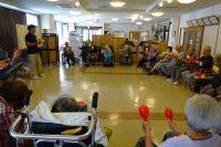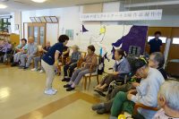 音楽療法を受けました。始めの歌で、雨降りお月さん、バラが咲いたを歌いその後、参加者全員で鈴・鳴子を持って365歩のマーチを歌いながら楽器と組合せ音楽へ引き込んで行くプログラムでした。楽器では太鼓、カラーベルを持って演奏に合わせ歌いました。演奏会的に利用者代表が指揮をやり歌の出だしを行ないました。大変良かったと聞きました。写真では先生の指揮に合わせ楽器の音合わせを行なっています。カラーベルやマラカスを持って歌いながら演奏も行ないました。毎月第二、第四木曜日の14時~15時まで音楽療法の時間帯です。見学や体験も受付けています。