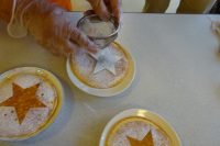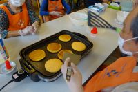 今回はデジタブルホットケーキを作りました。生地の中に野菜ジュースを混ぜてホットケーキを焼きました。ケーキの上に星型にシュガーパウダーを振りかけ完成です。可愛いケーキが出来上がり食べても美味しく好評でした。メニューについては作りたいもののリクエストを受けております。