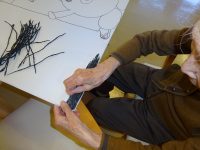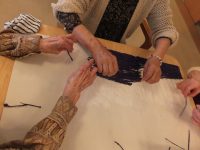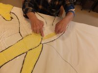製作状況)大きな板の下書きされた所に、紙縒り(こより)を一本づつ糊を付け貼り付けて行く作業を行なっています。