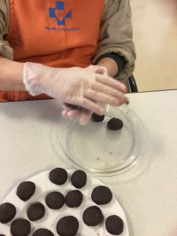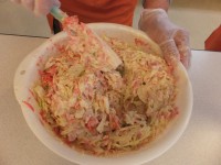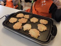 2月20日月曜日、今回はお好み焼きを作りました。具材を刻み小麦粉と良く混ぜている所です。量が多くて混ぜるのに大変でしたので皆さんと協力して行ないました。その後ホットプレートで焼きました。焼いている臭いが皆さんの食欲を誘い大変美味しかったと伺いました。今回も大変好評でありました。次回は2月27日です。メニューは楽しみにして下さい。