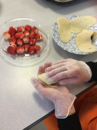 2月27日月曜日、今回はいちご餅を作りました。生地を焼き、あんこを入れその上にスライスいちごを挟んで完成です。旬のいちごを使い春を感じられたようです。次回は3月6日です。メニューは楽しみにして下さい。