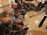 1月12日木曜日、音楽療法の日です。今年初めての音楽療法です。お正月、富士の山から歌い出しでした。楽器使用では太鼓を使い音楽の餅つきを行ない、トーンチャイム楽器で冬の星座、蛍の光を演奏しながら歌いました。変わった楽器では小さい木魚を使用しています。(写真)皆さん集中しておりました。次回はH29年1/26(木)です。