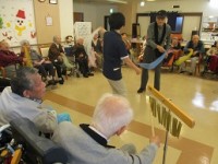 12月8日木曜日、音楽療法の日です。懐かしい歌よりたき火・りんごの歌を歌いました。(声を出して頂くと同時に一部楽器を使います。)下町の太陽・線路は続くよ・Evevy one・高校三年生(全員が楽器を持ち歌って演奏を行ないます。)世界は二人のために(スカーフを持って演奏に合わせ歌います。代表者によりダンスを行なう。繰り返し行なう。)聖この夜(トーンチャイム楽器を全員が持って歌って演奏)を行ないました。次回は12/22(木)です。