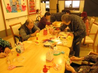 今日は牛乳パックをリサイクルして、うさぎの形に切った色画用紙を貼りつけて小さなバッグを作りました。毎回参加して下さる方は手慣れて作業がスムーズになって行くのが感じられます。色や模様の組み合わせや飾り付け等で、皆様頭を悩ませた様で、作り終えた後のお菓子がとても美味しかった様でした。