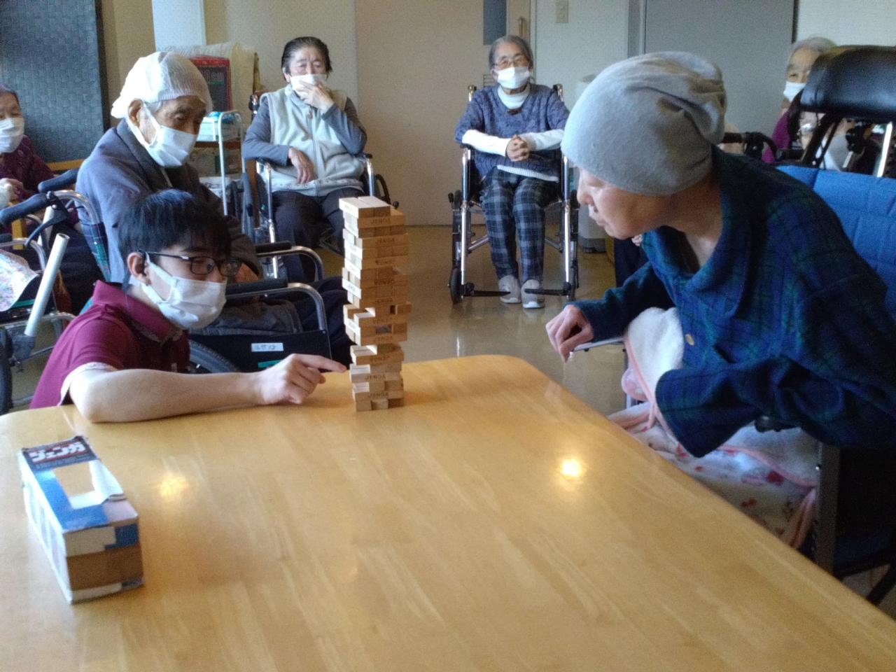 「ジェンガ」は入居者様の年代では馴染みの無いゲームかと思われますが、実際にやってみますと、なかなか倒れず、皆さん固唾をのんで見守られていました。なかなか良い集中力の訓練になると感じました。みなさんも久しぶりに集まって「ジェンガ」しませんか?(^^♪
