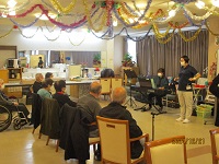 本日は今年最後になる音楽療法です。いつものように「世界の国からこんにちは」の替え歌から始まりました。その後、先生がサックスを持ってこられており「もみの木」「きよしこの夜」を披露してくれました。皆さん食い入るようにサックスの音色を静かに聴いておられました。クリスマスや正月にちなんだ歌も皆さんで歌い盛り上がりました。「ほたるの光」「星影のワルツ」で最後は締めくくりました。また来年もよろしくお願いいたします(^^♪