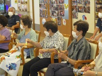 本日は皆さんが楽しみにしている音楽療法です。『世界の国からこんにちわ』の替え歌から始まり、夏にちなんだ歌を多めに演奏して頂きました。利用者様が簡単な振り付けを練習し、身体を動かしながら歌ったり、楽器を振りながら歌ったりと、あっという間に1時間がたちました。来月も楽しみにしていて下さい(^-^)