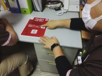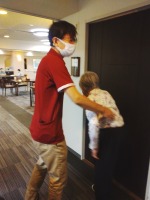 皆様にアナウンス→スタッフ誘導により避難(訓練)→階段移動できる方には付き添いにて階段避難をしました。