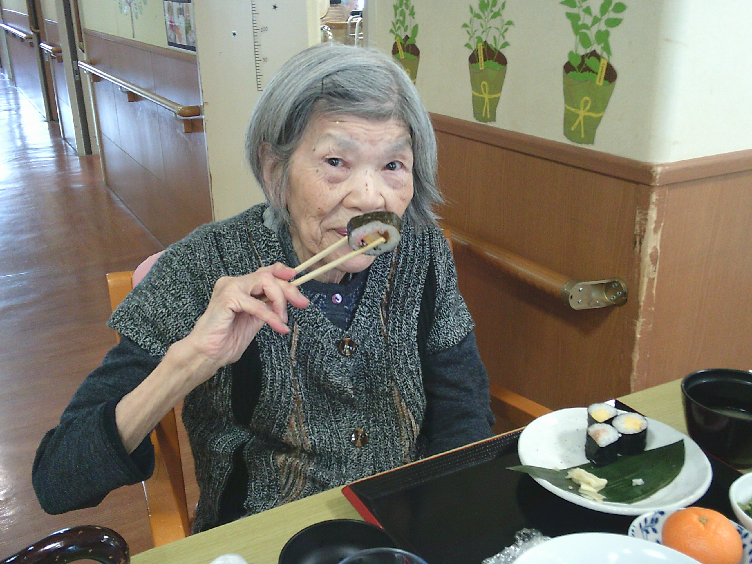 ランチに巻き寿司(恵方巻はキケンなので・・笑)、おやつにはカワイイ赤鬼の練りきりが出ました。