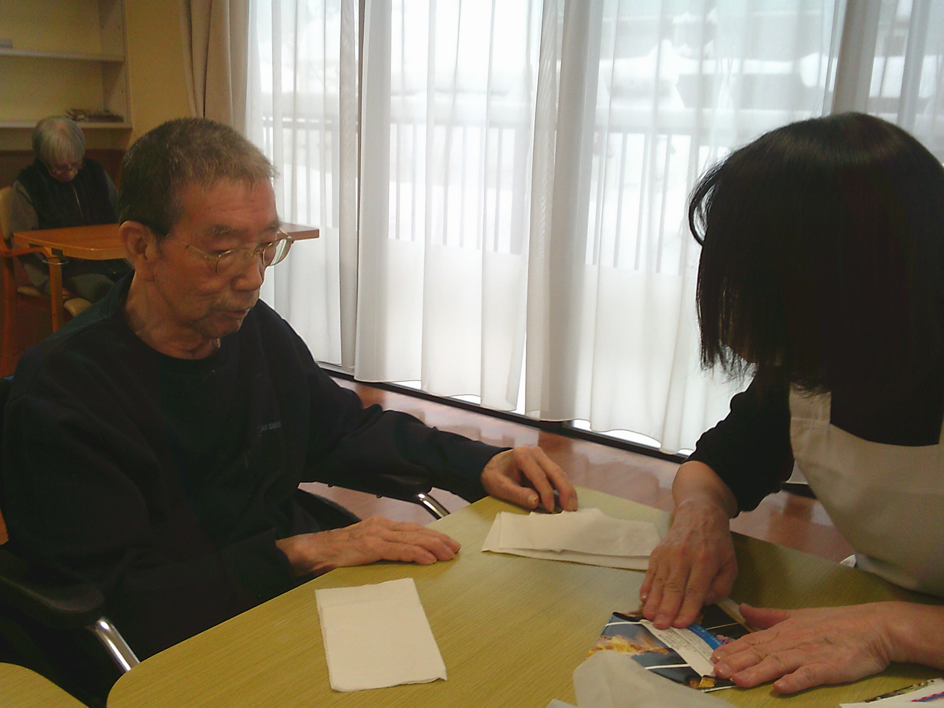 折り紙をしながら「お食事は美味しいですか?」「仲の良い入居者様はいらっしゃるんですか?」