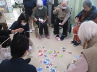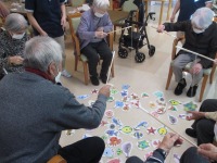 こんにちはデイサービスです。本日は久々に魚釣りゲームを行いました。魚の絵のカードを床に並べてお手製の釣竿でみなさまに魚を釣っていただきました(^^♪ 魚のカードの裏には点数が書いてあってその合計点を競っていただきました♪ ここでは高級魚でも点数が高いわけではないのでなるべく数多く釣るのが高得点を出す秘訣のようです(^^♪ 中には「ウナギを釣ったのにたった10点だったよ」と残念そうに仰る方もいれば「イワシを釣ったのに50点だったよー」と嬉しそうな方もおりました! みなさま楽しそうに参加され大盛り上がりの1時間となりました\(^_^)/