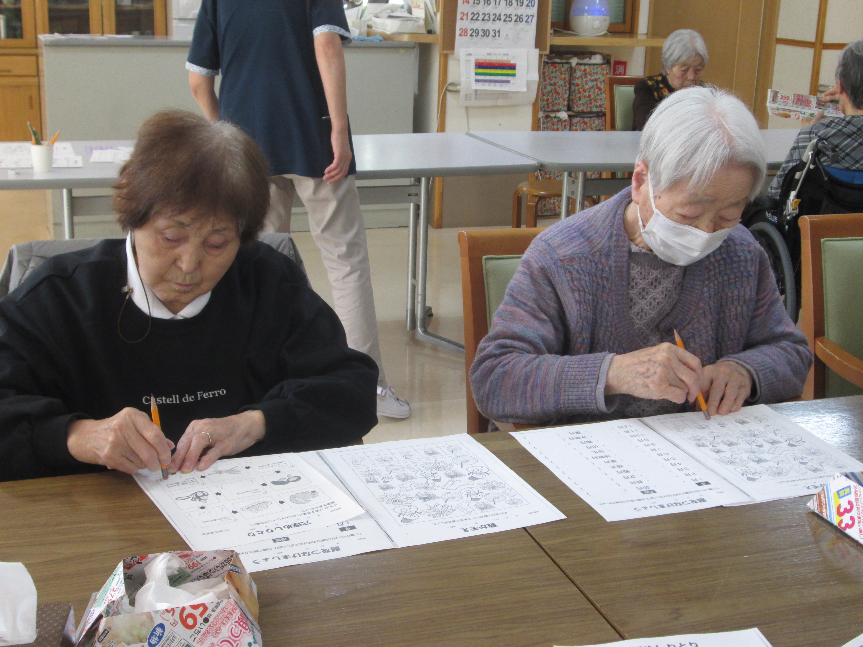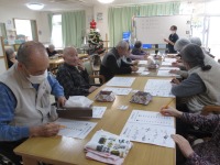 こんにちはデイサービスです。今日のレクは、利用者様に好評の脳トレです。脳トレプリントに描いてある絵を見てしりとりを完成させるのですが、中々初めの絵の答えが出てこないので先に進めず(>_<)「この絵はなんだろう⁇」「ネズミかな?」「違うよ、リスだよ!」という具合で会話されている様子が多くありました。あちこちで笑い声も多くありました。(*^^)v 毎回、大好評の脳トレ❣ 今日も大好評でした(笑)(≧▽≦)