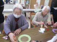 こんにちはデイサービスです。本日は制作ということで可愛らしいひな飾りを作りました(^^♪ 紙皿の中をくり抜きお花紙で巻いたものに、おひな様とお内裏様を折り紙で作って貼っていきます。着物は和柄の千代紙を使い、あらかじめ用意しておいた烏帽子やししゃく、扇子などの小物をつけ、みなさまにはペンで顔を描いていただき、最後に桃の花やぼんぼりを貼って完成です(^^♪ とても可愛らしいひな飾りを見て「可愛く出来たから早く部屋に飾りたいな」「ひ孫に見せて自慢したいな」と皆様嬉しそうに話されていました♪ 本日のレクも大成功でした\(^_^)/
