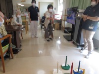 こんにちは、デイサービスです。本日はゲームレクで輪投げを行いました。「子供のころ振り」という方もいらっしゃいました。輪投げの棒に点数が書かれており合計点数を競い、一番得点を稼いだ方は100点に輪を4本入れておりダントツで一番でした!コントロールのよさに驚きです。(@_@) 1本もわが入らない方は誰もいませんでした。応援の声も多く聞かれ楽しい時間になってよかったです。