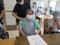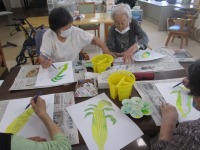 こんにちは、デイサービスです。今日はとうもろこしの下絵を使って水彩画教室を行いました。