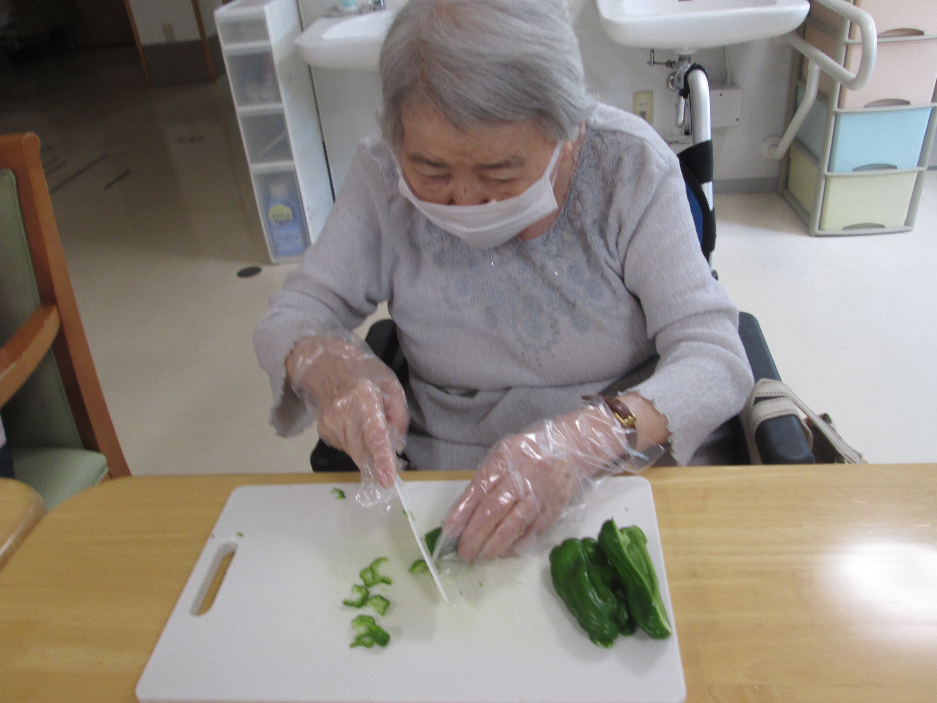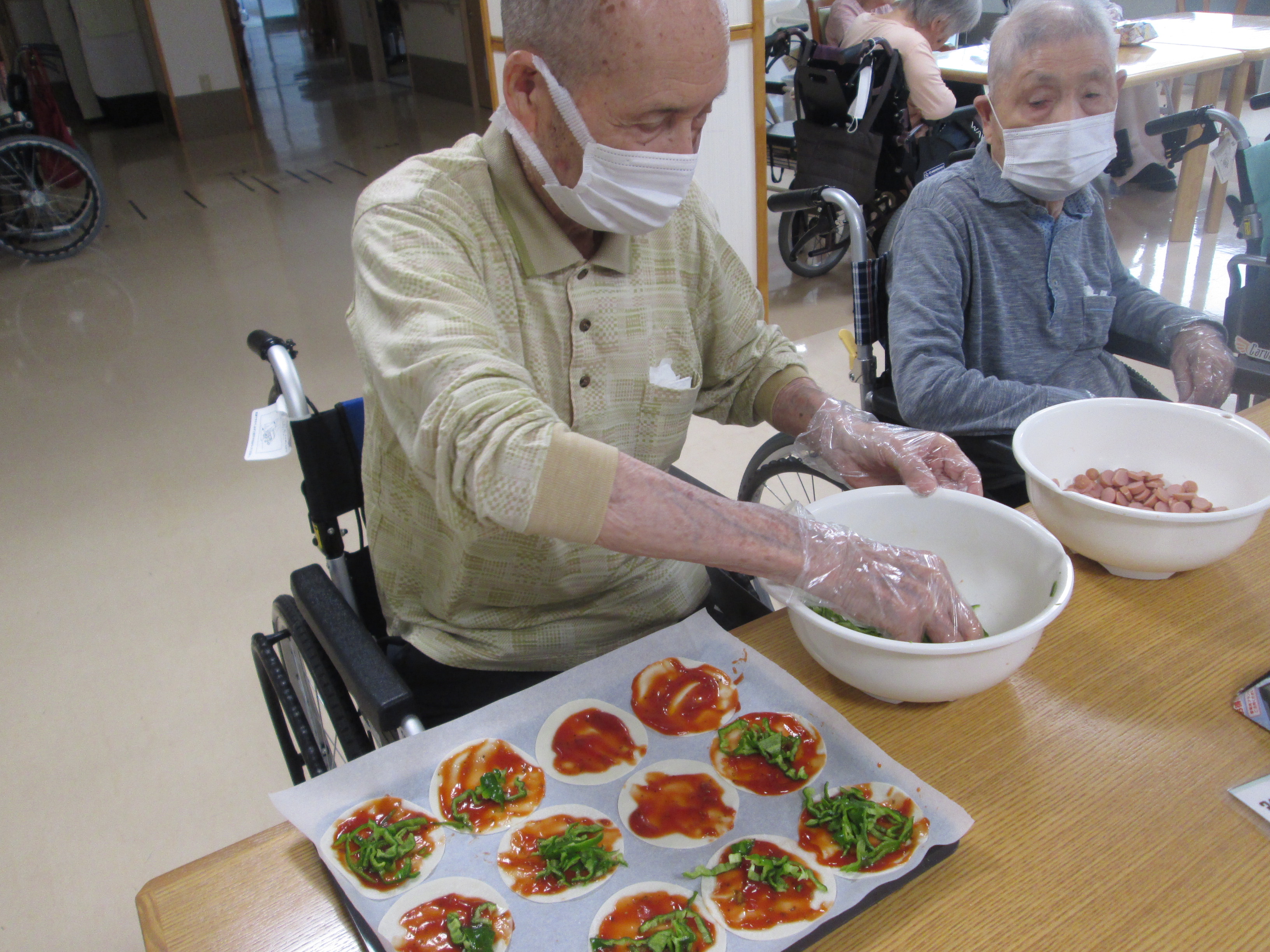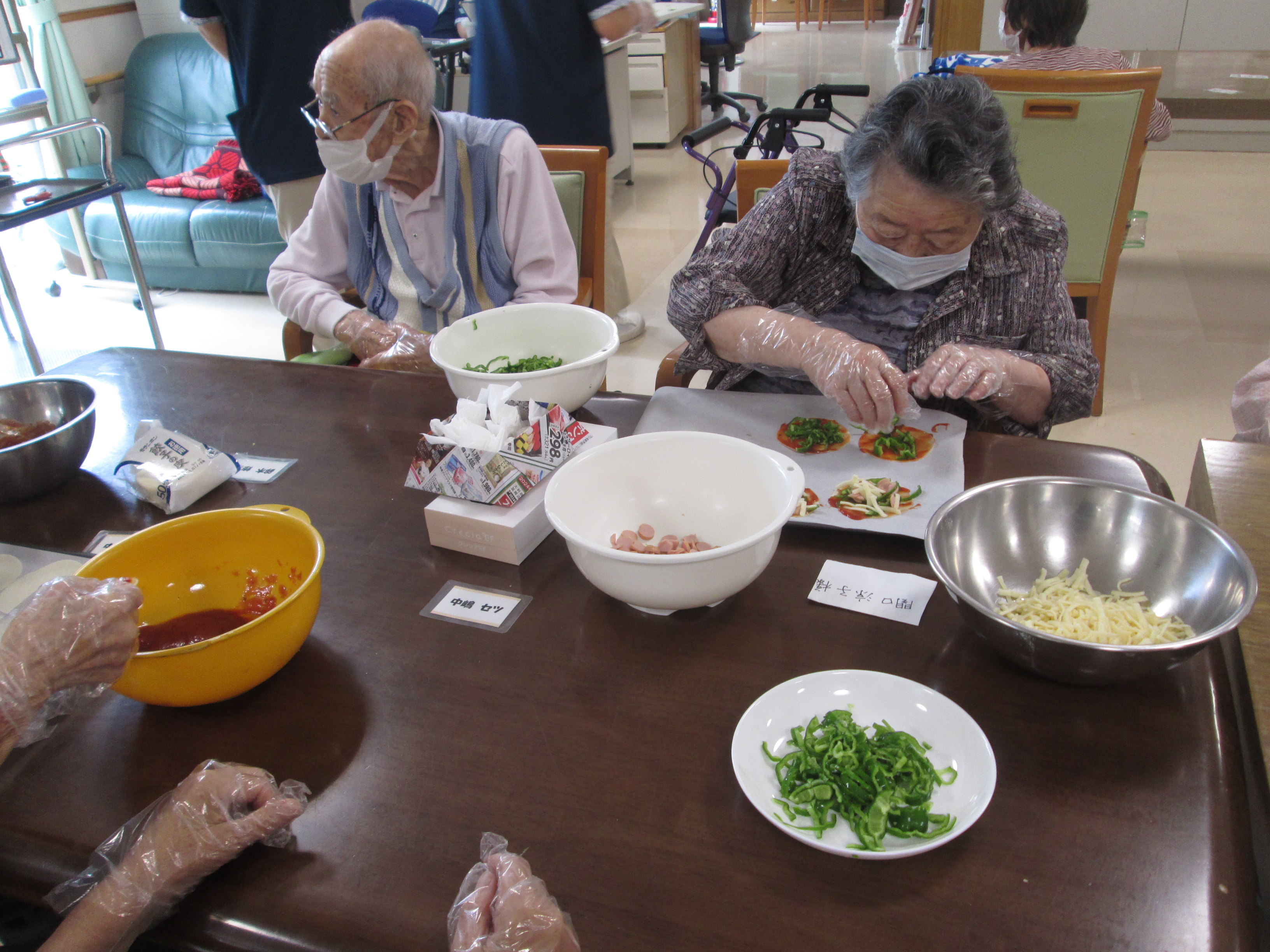 今日の料理教室は餃子の皮を使ったピザ作りを行いました。トマトソースはケチャップ、オリーブオイル、バジルを混ぜて手作りです。トッピングのピーマンやソーセージを細かく切って、餃子の皮にトマトソースを塗って、トッピングの具材とチーズをのせたらホットプレートで焼きます。デイルームがチーズのいい香りに包まれました。「こんな簡単にピザが作れるんだね」「美味しかったよー」とご利用者様からも大好評でした☺