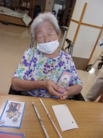 こんにちは、デイサービスです。本日のレクリエーションは書道教室を開催しました。今月の文字は「梅雨明け」「花火」「そうめん」「友情」でした。