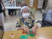 こんにちは、今日は夏の壁面制作教室でした。テーマはひまわり畑です。ご利用者様にはひまわりの葉っぱ作りから取り組んでいただきました。細かい作業でも皆さん手先が器用なので黙々と続けてくださいます。茎とはっぱが完成したらメインのひまわりの花をくっつけて、壁面に貼りつけてもらいます。ご利用者様から「青空があった方がいい」と素敵なアドバイスをもらったので、ちぎり絵で青空作りも始めました。明日も続きをする予定です。完成が今からとても楽しみです(*^_^*)