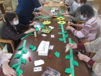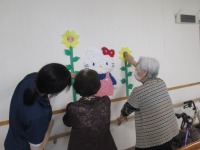 こんにちは、デイサービスです。本日は昨日の壁面制作のつづきを行いました。今日の皆様には青空をちぎり絵で作って頂きました。「白いところがあるよ」「真っ青な空にしようね」と真剣に空色の折り紙を貼って下さったおかげでとても綺麗な空が完成しました。有難うございました。