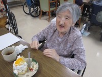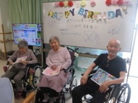 本日はお誕生日会も行いました。3人の方が今月のお誕生日を迎えました。御三方とも実年齢よりとても若々しく見えます(゜o゜)!元気の秘訣は「クヨクヨ悩まないこと」だそうです。本当におめでとうございました。来年もいっしょにお祝いできたらうれしいです。