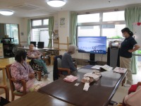 こんにちは、デイサービスです。保温実のレクリエーションは、懐メロを楽しもうという音楽レクを行いました。童謡や懐かしの歌謡曲を歌ったり、曲名クイズを出したり、懐かしの童謡に合わせて体操を行ったりしました。「昔の曲ならすごくよく覚えている」と「もしもしカメよ」を歌詞を見ずに4番まで歌ってくださる方もいました。私は1番しか知らなかったのでとても驚きました。(゜o゜)!