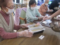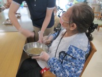 こんにちは、デイサービスです。今日の料理教室は紅茶のパウンドケーキを作りました♪ホットケーキミックス、たまご、牛乳、紅茶の茶葉を混ぜてオーブンで40分焼きます。作る工程は少ないのですが生地を混ぜるのに少し力が必要なので全員の協力が必要になります(-_-;)焼き上がりが近づくとデイルームが甘い香りに包まれていました♪生クリームを添えて召し上がっていただきました。「美味しいね」「紅茶の味がしっかりしていていいね」と大好評でした(^O^)