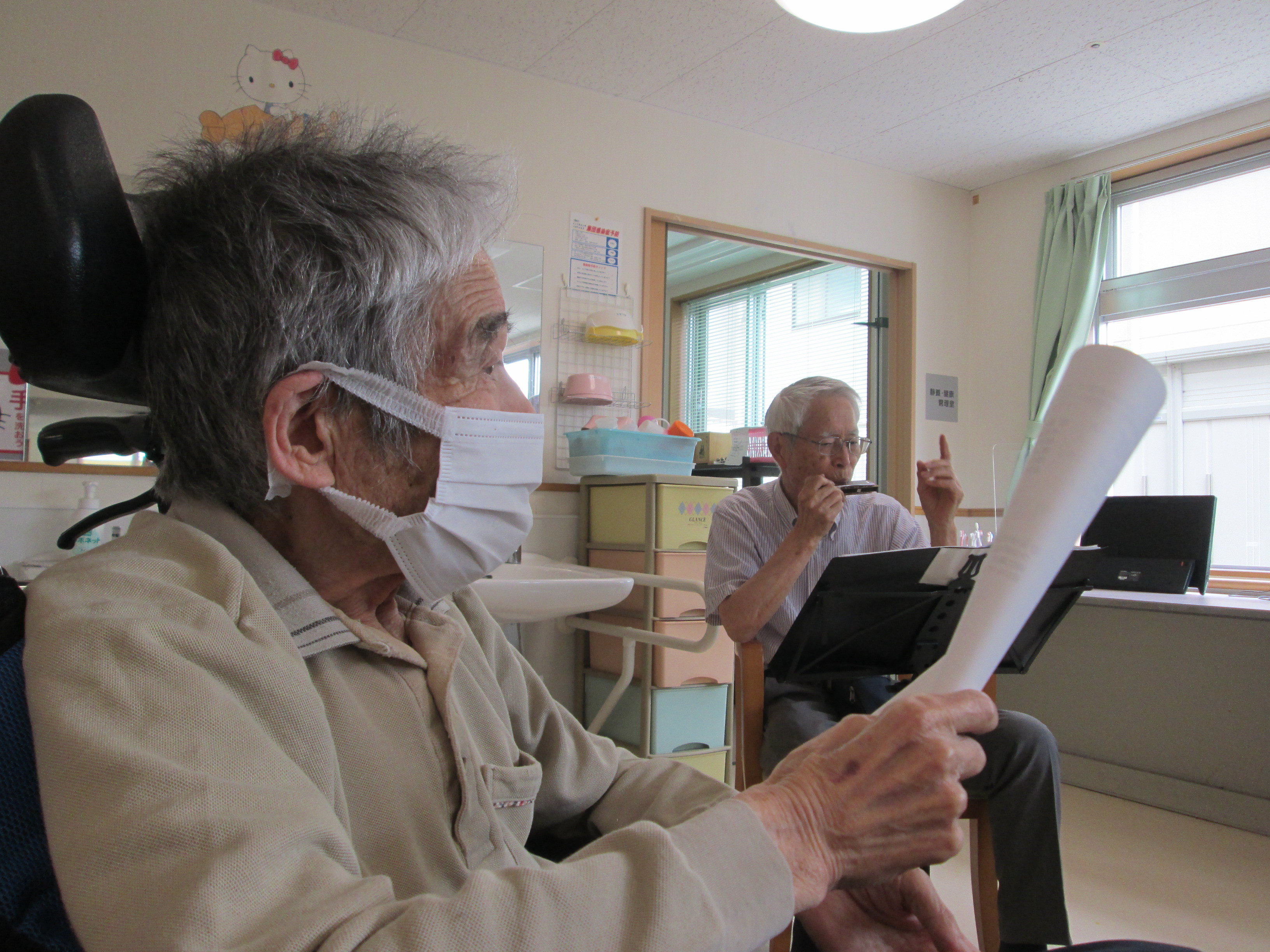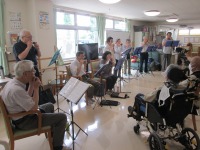こんにちは、デイサービスです。本日は「南橘ハーモニカクラブ」の皆さんが慰問演奏に来てくださいました。「朧月夜」「牧場の朝」「ロンドンデリーの歌」「北国の春」などアンコールも含め全13曲を演奏して下さいました。歌える曲をたくさん演奏して頂き、ハーモニカの綺麗な音と共に歌を歌うことができて、みなさま大満足のようでした。(*^_^*) 途中には独奏でお一人で演奏して下さる曲もあり、ハーモニカの音色を充分に胆嚢することができました。本当にありがとうございました。