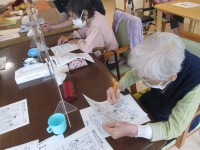 「災害時などに懐中電灯と一緒に使うとランタンの代わりになるものは?」(正解はペットボトルの水です)など、暮らしに役立つ情報を知ることができてご利用者様も「知らなかったねー」「もっと教えてよ」と大盛り上がりでした(^O^)わからない問題はご利用者様同士で一緒に考えたりと充実した時間が過ごせました♪