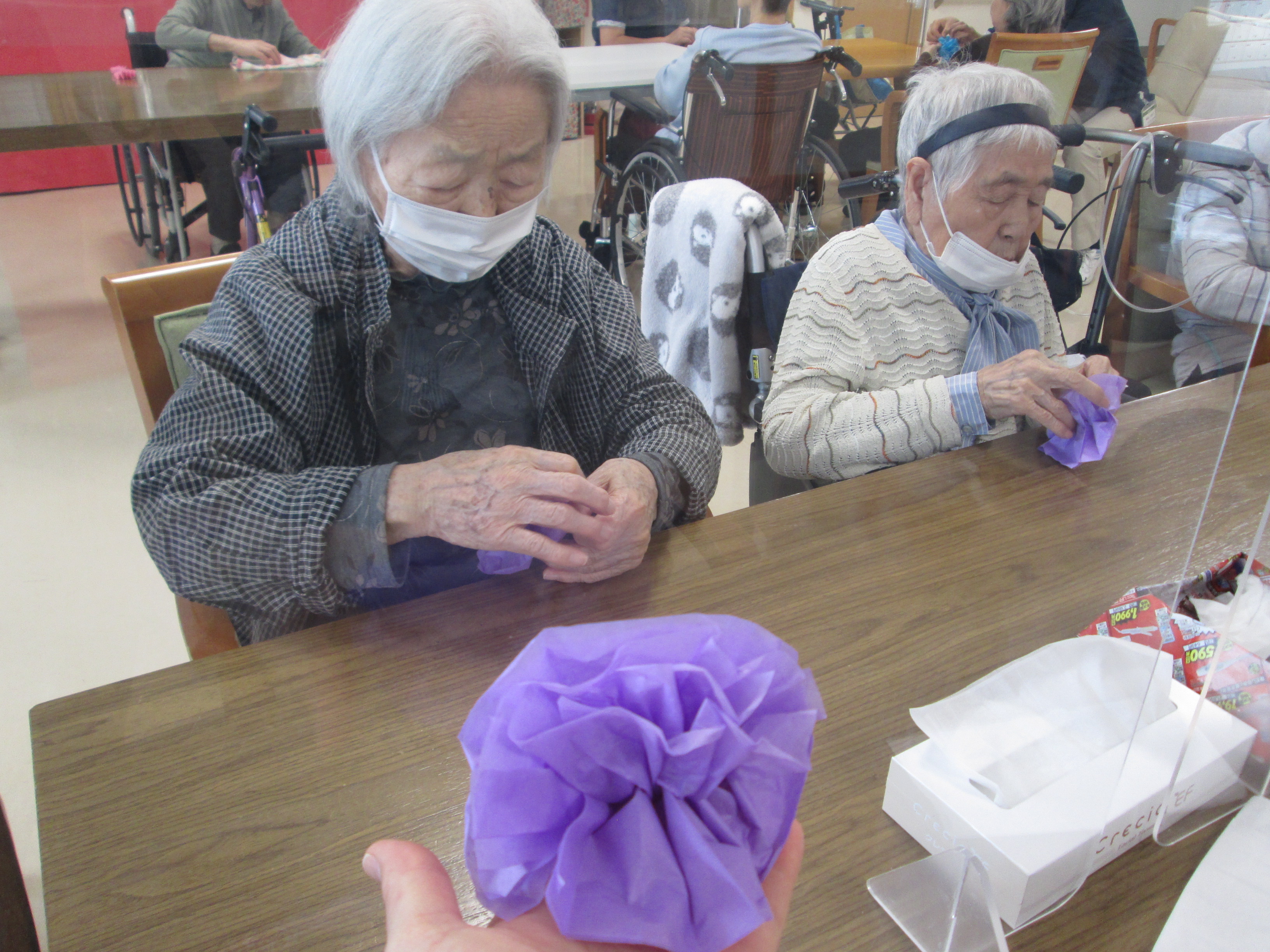 こんにちは、デイサービスです。今日はおはながみを使ってアジサイの花びらを作りました。開いたお花にアクセントで同色の小さく切った折り紙をくっつけています。5~6個に集めて壁面に貼りつけ、葉っぱをくっつけて完成です。デイルームがあっという間に梅雨の雰囲気になりました(*^_^*)もう少しアジサイの花が欲しいので明日も作業をお願いする予定です♪