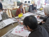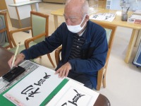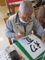 お手本は「五月」「新緑」「新茶」「初夏」「皐月」「柏餅」「柏もち」でした。書道を習っていた方もいらっしゃるので草書体のものもご用意しました。皆様、真剣に半紙に向かっていました。「この字は曲がっちゃったな」「あなたは良い字を書くね!」「あなたの初夏は爽やかな文字だよ」などと、お互いを褒める声も多く聞かれました。(^O^)
