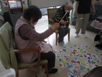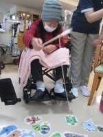 本日のレクリエーションは「魚釣りゲーム」を行いました。魚は裏返すと10点~50点までの点数が書かれています。魚の表面と釣竿にはそれぞれ磁石が付いており、魚が釣れるようになっています。