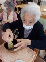 外出しなかったご利用者様は「春のお茶会」という事で茶道のクイズをした後に、自分で点てたお茶を楽しんでいただきました!「自分で点てるとまた味わいが出るね」「こんな美味しいものいただいていいの」とこちらも喜ばれていました。