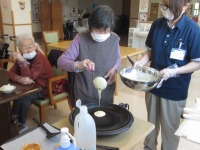 まずはじめにいちごを食べやすいサイズに切って頂き、そのあとにホットケーキミックスを使って生地作りを行いました。生地を混ぜるのが大変だったようで「腕が筋肉痛になっちゃいそうだよ」との声が聞かれました。焼けたパンケーキにお好みのトッピングをしていただくため、いちごの他にメープルシロップ、あんこ、生クリームをご用意しました♪