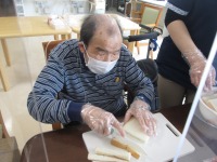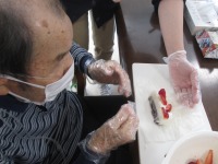 濡らしたライスペーパーにあんこと細長く切ったパン、生クリーム、4等分にスライスしたいちごを乗せて巻いたら完成!見た目も可愛い生春巻きでした。(*^_^*)余ったいちごもお皿にのせたのでたくさんいちごを食べられました。デイルームにいちごの香りが充満して、口々に「いい香りだね」「いちごが美味しい」と声が聞こえてきました。