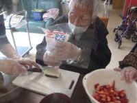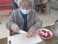 こんにちは。本日のデイサービスは「いちごフェア」ということで「いちごの生春巻き作り」を行いました。