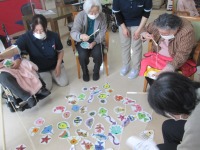 こんにちは、デイサービスです。今日はデイルームに臨時で釣堀を作って(笑)、魚釣りゲームに参加していただきました。いか、たこ、カニ、ふぐ等の様々な魚介類のイラストが放たれています。釣竿で時間いっぱい釣ってもらってイラストの裏に書かれている点数を合計して競いました(*^_^*)合計点数はご利用者自身に計算してもらうので脳トレにもなります。「ウニが釣れたけど点数が低かった」「釣りなんて初めてだけど楽しいね。」等の楽しい会話もあって充実した釣り時間になりました(^O^)