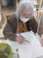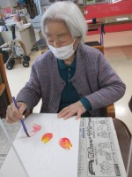 今日のレクはチューリップの水彩画を行いました!チューリップのお花を赤色や黄色、ピンク色を色鮮やかに塗ってくださっていました。黄色から赤にグラデーションで仕上げて下さっている方もいらっしゃいました♪塗っている間はご利用者の皆さま黙々と進めており、仕上がって来ると周りの方と「その色は綺麗だね」「上手だね~」と会話されていました(*^_^*)