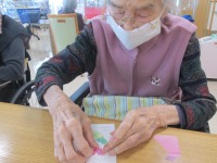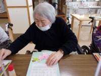 本日のレクリエーションは4月のカレンダー制作を行いました!ご利用者の皆様には緑の折り紙でウグイスを折っていただき、桜の花は職員が折り紙を飾り切りした物をたくさんご用意しておきました。台紙も好きな色を選んでもらい桜の木の枝、桜の花、ウグイスをどこに貼りつけるかはご利用者様の自由です♪皆様笑顔で周りの方と会話しながら制作に取り組まれていました(*^_^*)