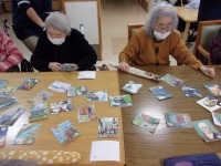 こんにちは、デイサービスです。今日は機能訓練レクということで前半はリハビリ棒を使った棒体操、後半は上毛かるたを行いました。棒を頭の後ろにセットして真上に上げたり、胸の前にセットして腕を左右交互にひねったりと肩関節周囲の筋力トレーニングでは皆さん熱心に取り組んでくださっていました。機能訓練なのになぜかるた?とも思われますが、しっかりと効能はあります(^O^)馴染みのある活動なので回想法としての効果があり、言語理解力の強化になり、手札を多くとることで達成感が得られるのだそうです。体も脳もしっかりと使ってリフレッシュできました(^_^)