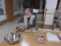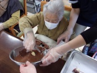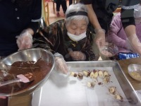 バナナを四等分に切って、溶かしたチョコに絡めて、チョコスプレーをふりかけました。「バナナが良いバナナだね!」「このまま食べても美味しそう」と声がありました。溶かしたチョコレートの良い香りもデイルームに充満しておりました。