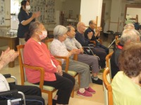 こんにちは、デイサービスです。今日は敬老会レクということでサックス、トロンボーン、尺八の演奏にAKOの皆様に来ていただきました(^^♪ 「水戸黄門のテーマソング」に始まり、「青い山脈」「蘇州夜曲」「人生いろいろ」などいつもカラオケで聞いている曲をたくさん聞かせてくださいました。ご利用者様も馴染みのある曲ばかりなので手拍子や歌を口ずさみながら楽しまれていました。楽器の紹介や曲のエピソードなどの話も聞かせてくださり、充実した時間が過ごせました。アンコールにも応えていただき、「コーヒールンバ」で全員でノリノリで楽しませていただきました(笑)