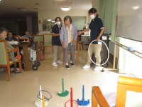 こんにちは、デイサービスです。今日のゲームレクは輪投げでした。高得点目指して皆さん頑張ってくださいました(*^-^*)毎週、地域の輪投げに通っているというH様にコツを聞いたのですが「そんなものはないよ」とのことでした(笑)点数の計算も皆さんにしていただくので脳トレにもなります(@_@)頭も体も使って有意義な時間が過ごせました。